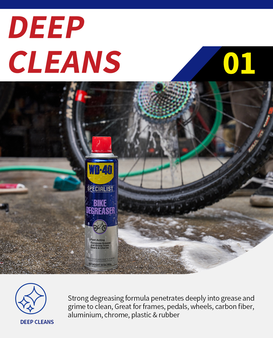 WD-40 Specialist® Bike Degreaser foaming action clings to chain, cogs and gears to deeply penetrate and remove stubborn grease and grime from all moving parts. Experience the difference of a fast-acting professional grade formula that removes dirt, mud & grime.