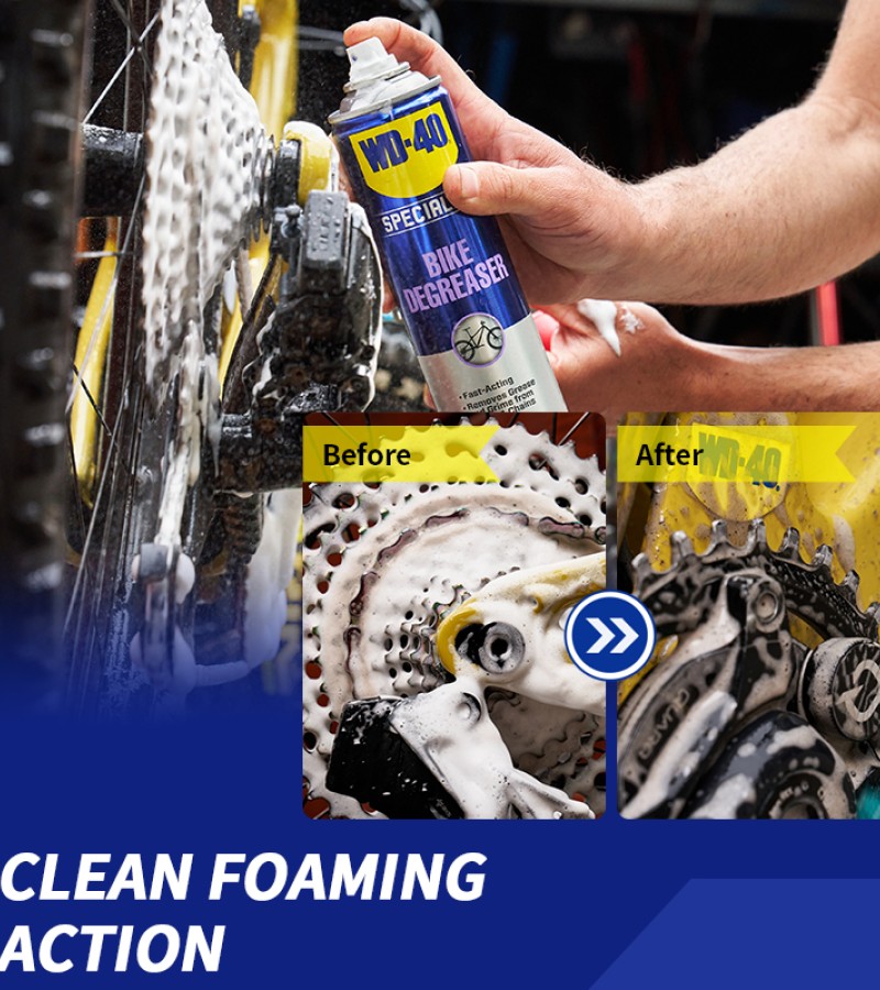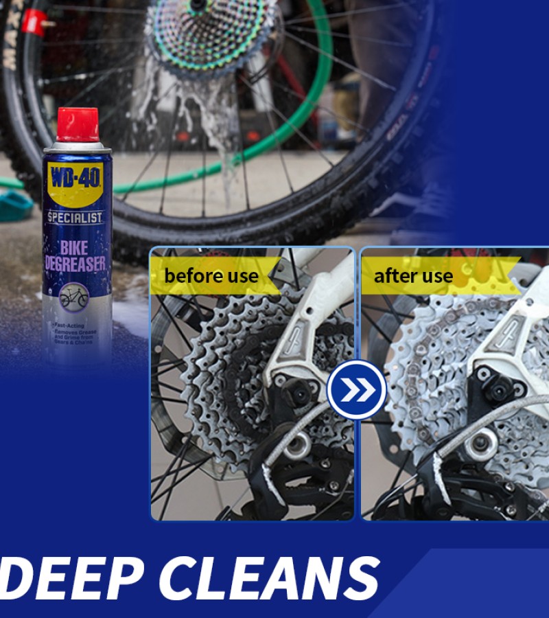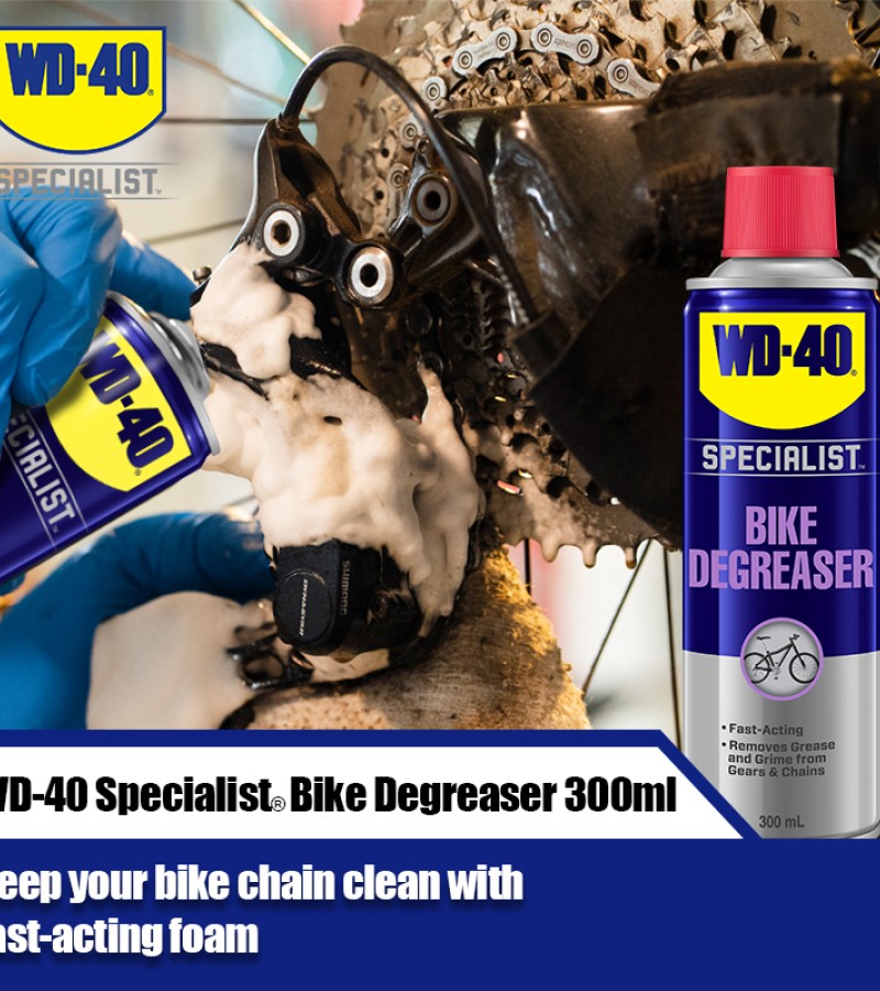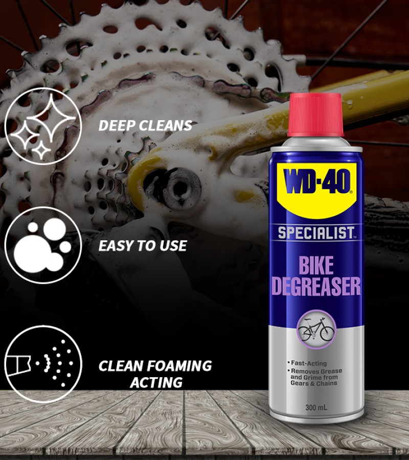 WD-40 Specialist® Bike Degreaser foaming action clings to chain, cogs and gears to deeply penetrate and remove stubborn grease and grime from all moving parts. Experience the difference of a fast-acting professional grade formula that removes dirt, mud & grime.