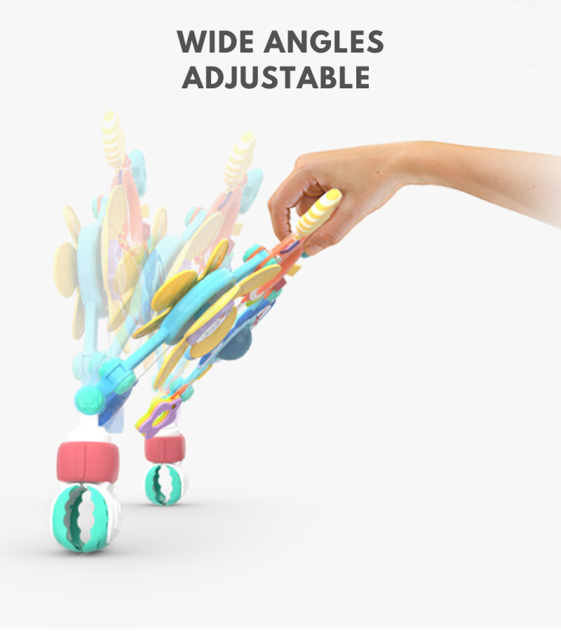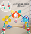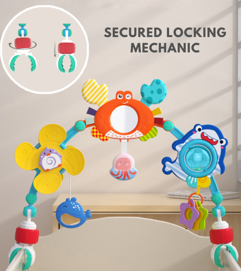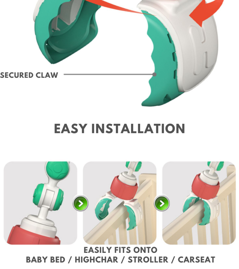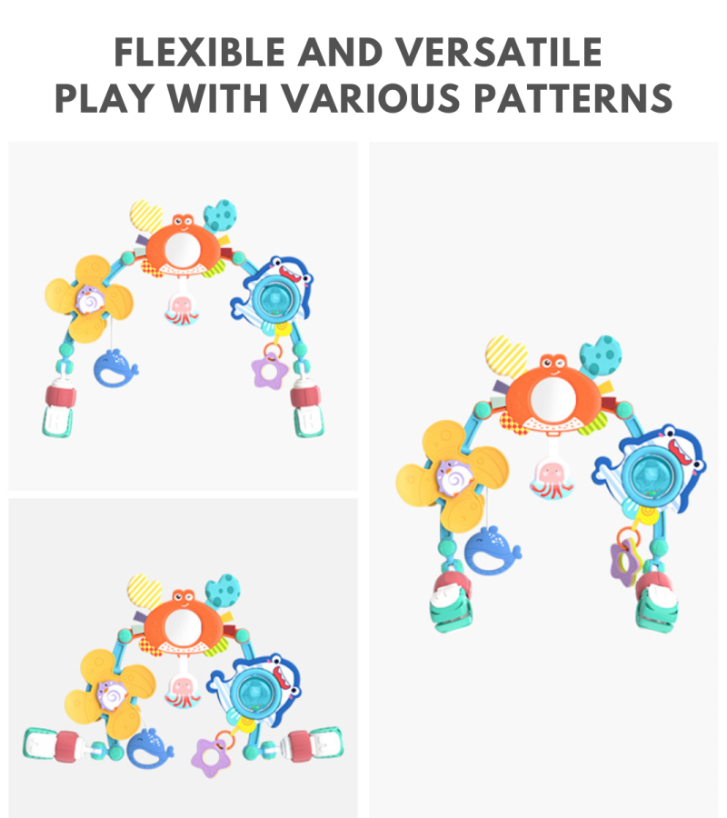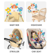 This mobile is designed to fit onto car seats, highchairs, baby beds, strollers, and more. It's flexible and adaptable to any environment, making it perfect for on-the-go parents.