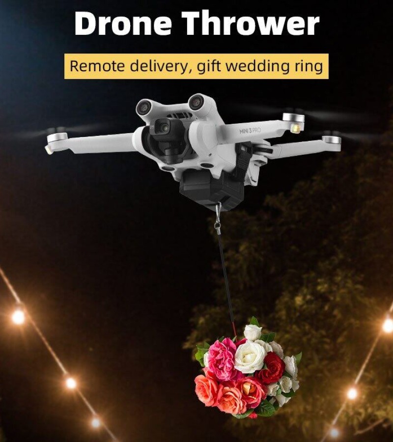 1. Drone thrower, which can be delivered remotely, is used for advertising, throwing bait, throwing gifts, delivering meals, giving wedding rings, etc;