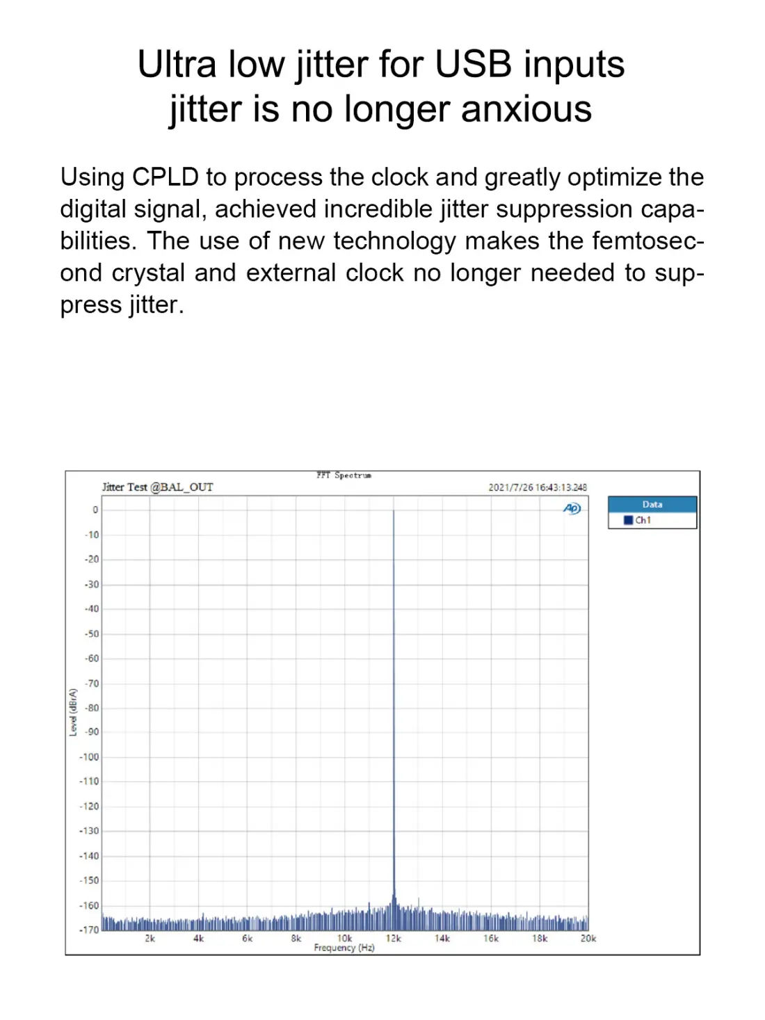 Using CPLD to process the clock and greatly optimize the digital signal, achieved incredible jitter suppression capabilities. The use of new technology makes the femtosecond crystal and external clock no longer needed to suppress jitter.