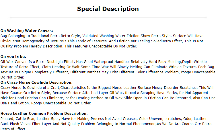 - Material:Washing Water Canva,Oil Wax Canvas,Cowhe,Crazy Horse Cowhe,Washing Water Canva